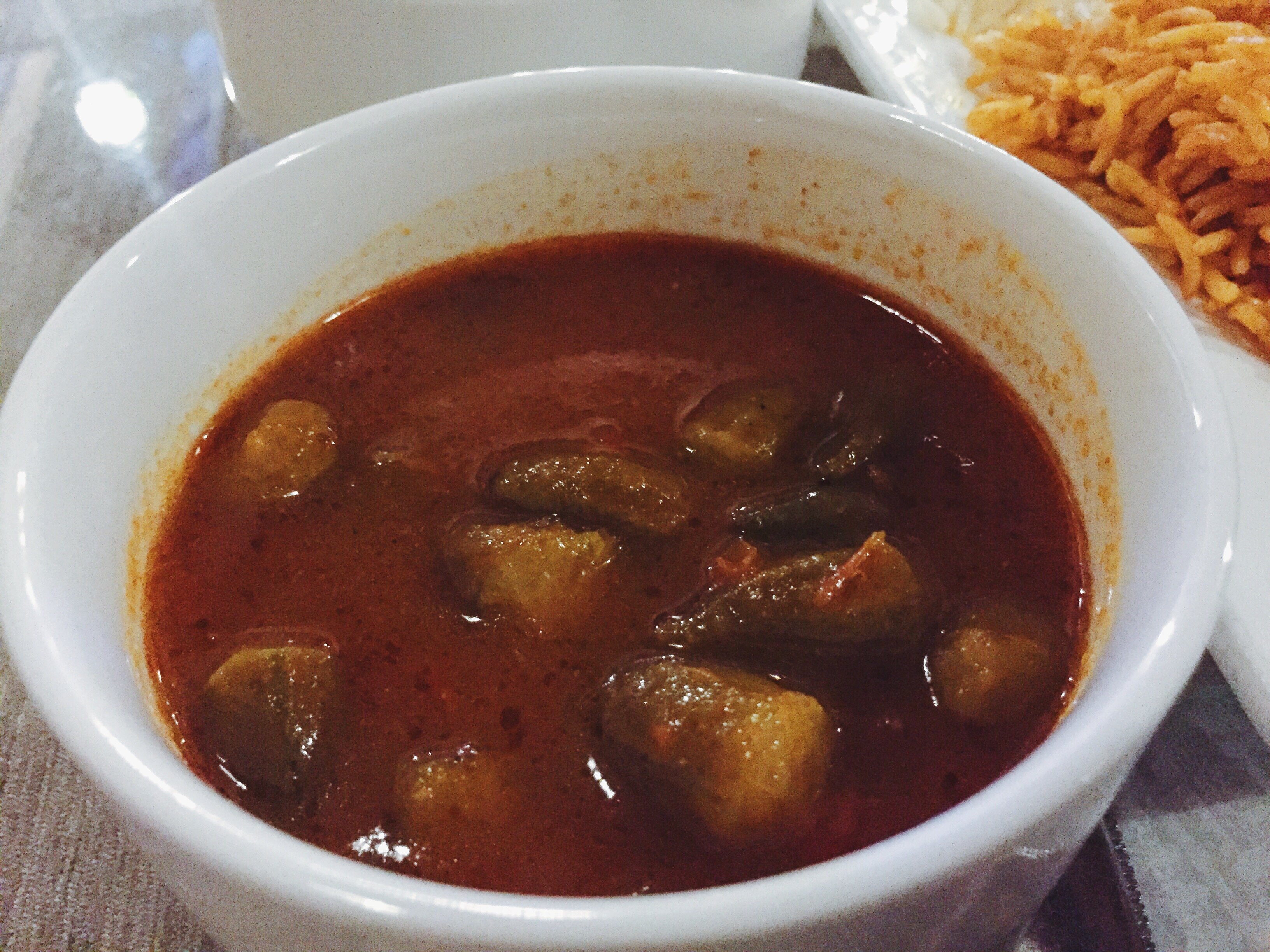 My Lamb Qouzi/Ouzi came and the waiter was right; the rice portion was for like two or three persons. The dish came with two sides: traditional okra stew and white bean stew. I skipped past the white bean stew because it tasted like baked beans, and I am not a huge fan of baked beans (but my best friend Rasyidah eats it with baked rice once upon a time). But the tiny okra cooked in tomato paste was flavourful.
